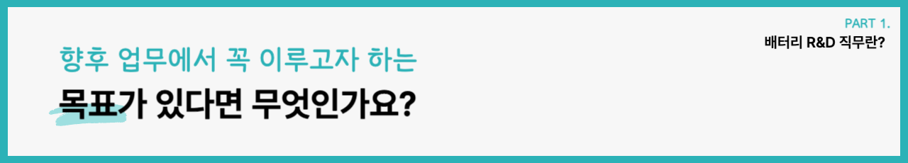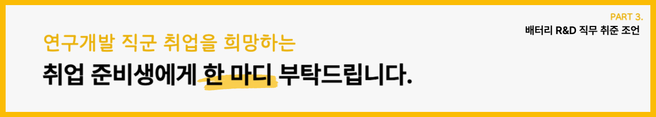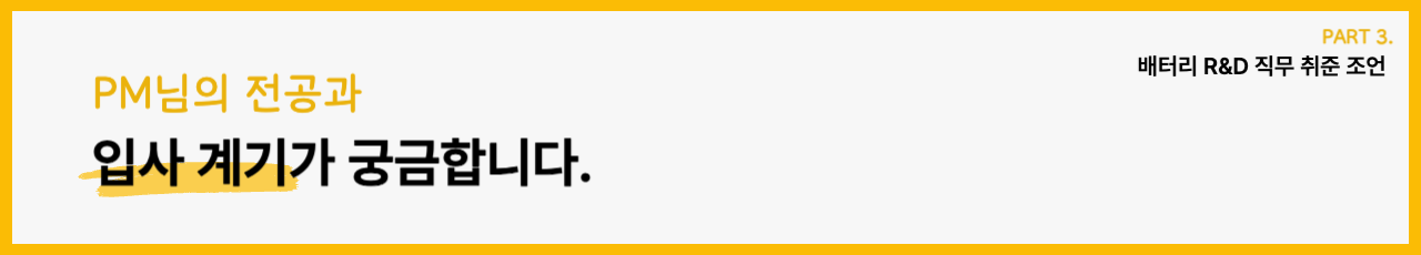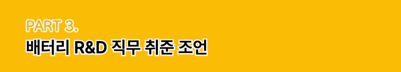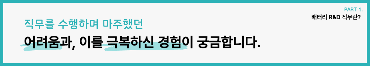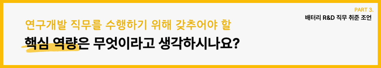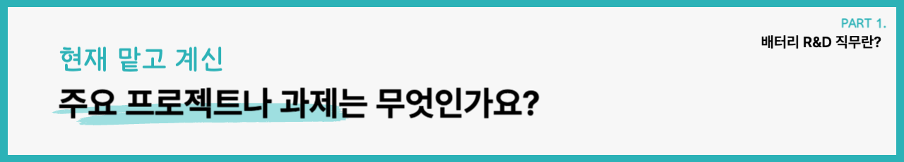 석사 과정에서 전고체전지를 전공하며 연구했던 경험뿐만 아니라, 현업과 관련하여 고민하는 등 직무와 직접적으로 연관된 경험을 쌓은 것이 가장 도움이 되었습니다. 뻔한 대답처럼 들릴 수 있어서 좀 더 자세히 말씀 드리면, 직무와 연관된 경험을 했다는 것은 단순히 그 일을 해봤다는 의미를 넘어서, 그 업무에 대해 고민해 봤다는 것과 같다고 생각합니다.