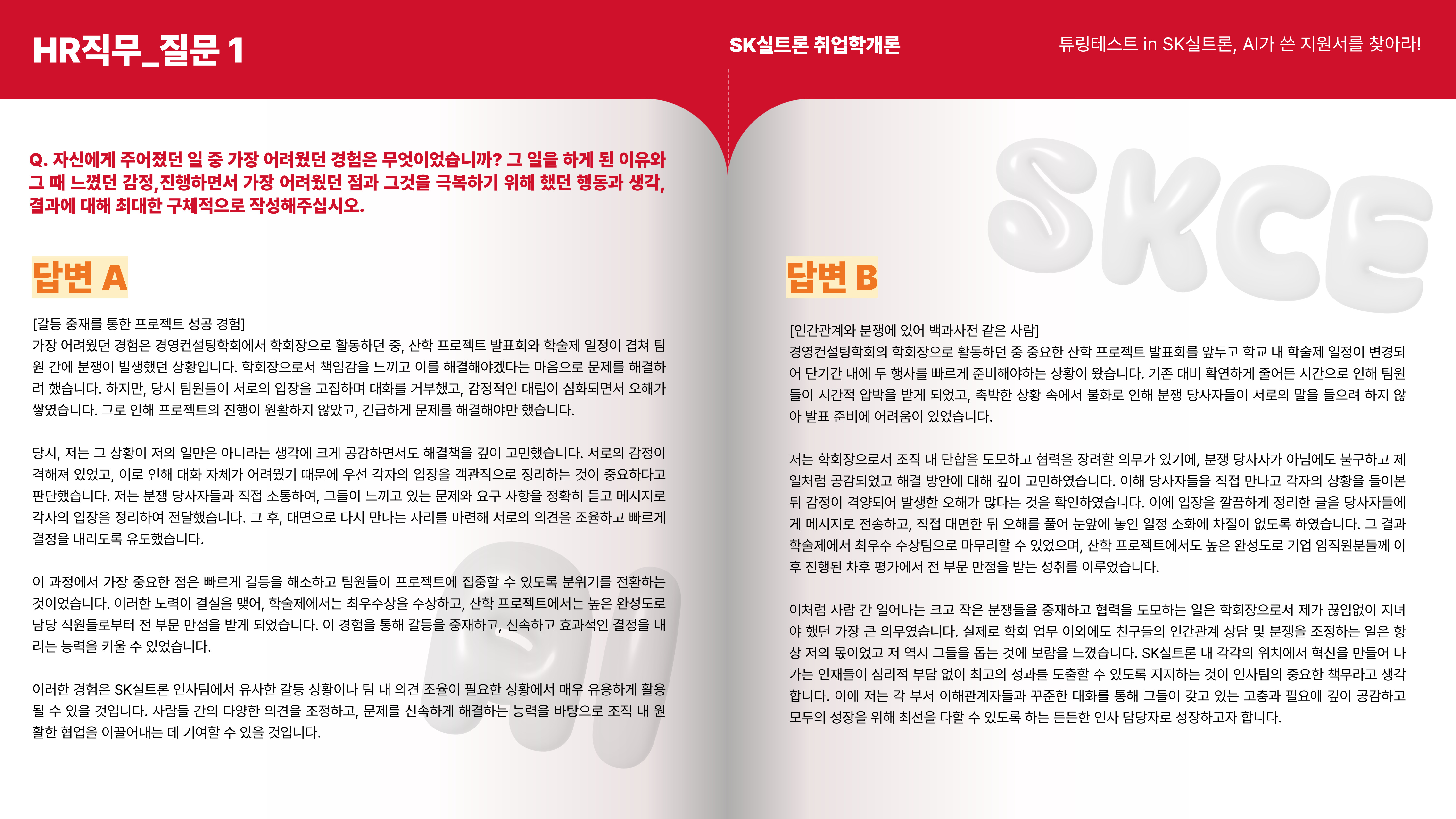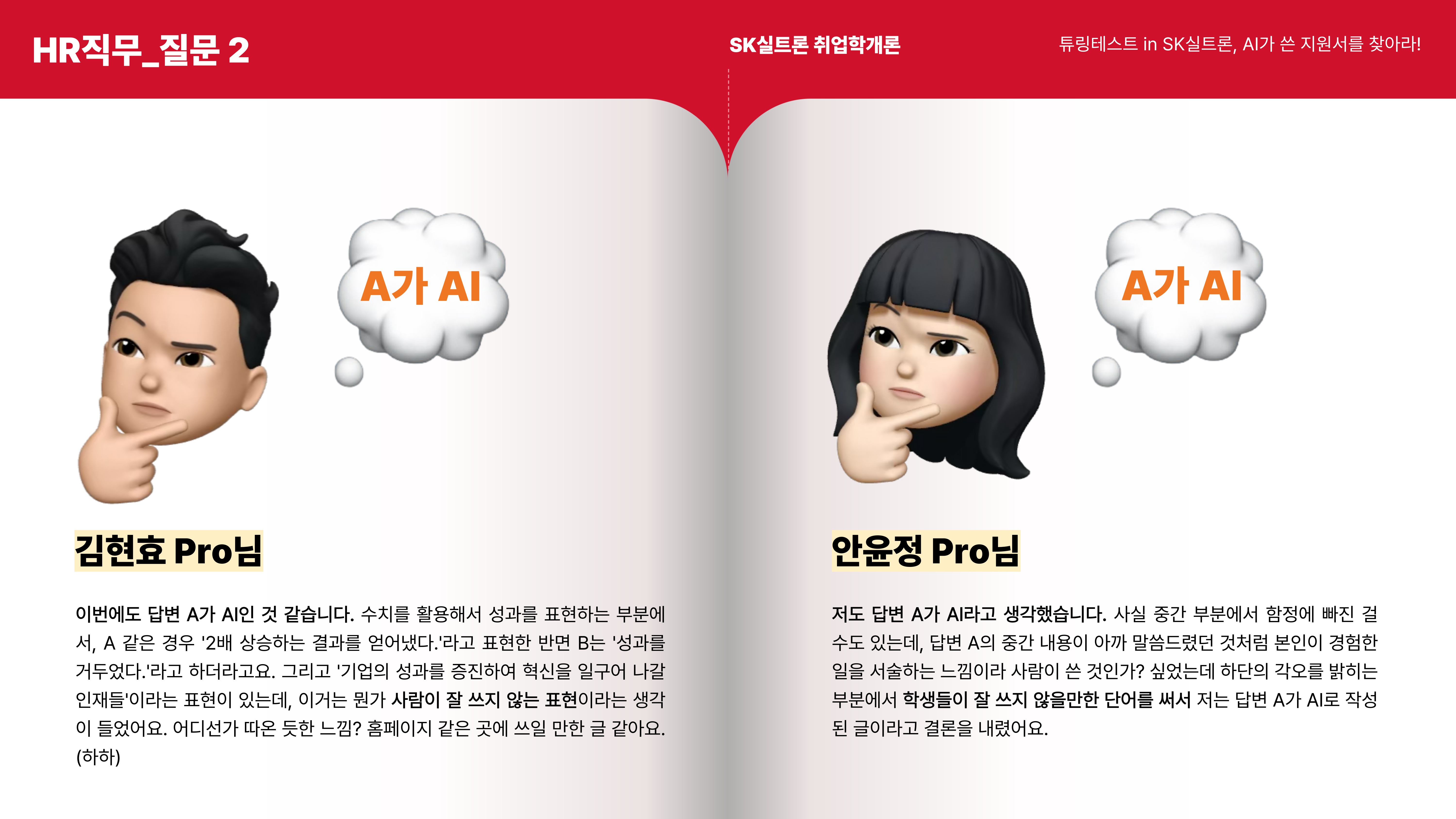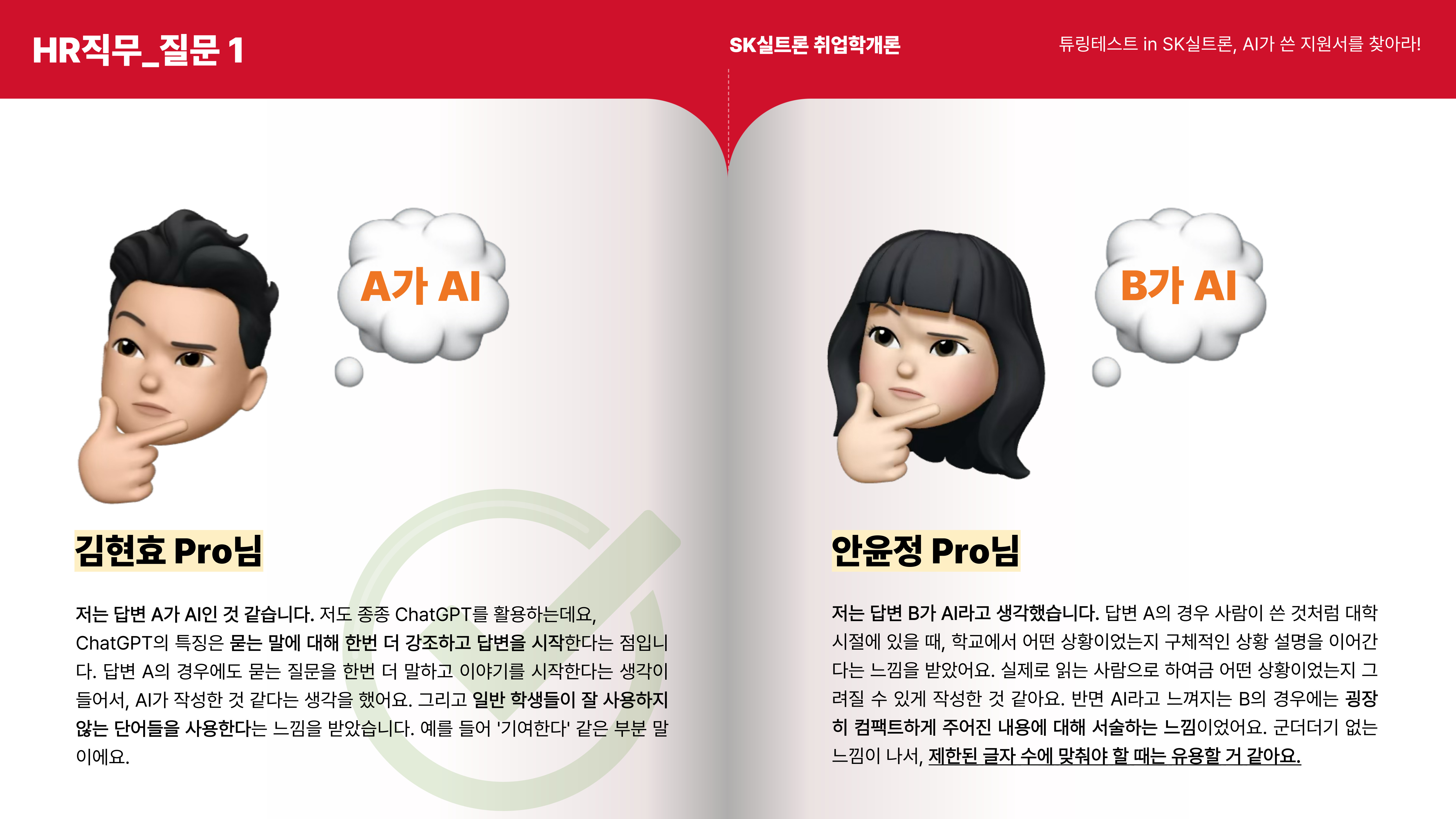 HR 직무 지원서의 첫 번째 질문은 A가 AI, B가 사람이 작성한 답변이었습니다.