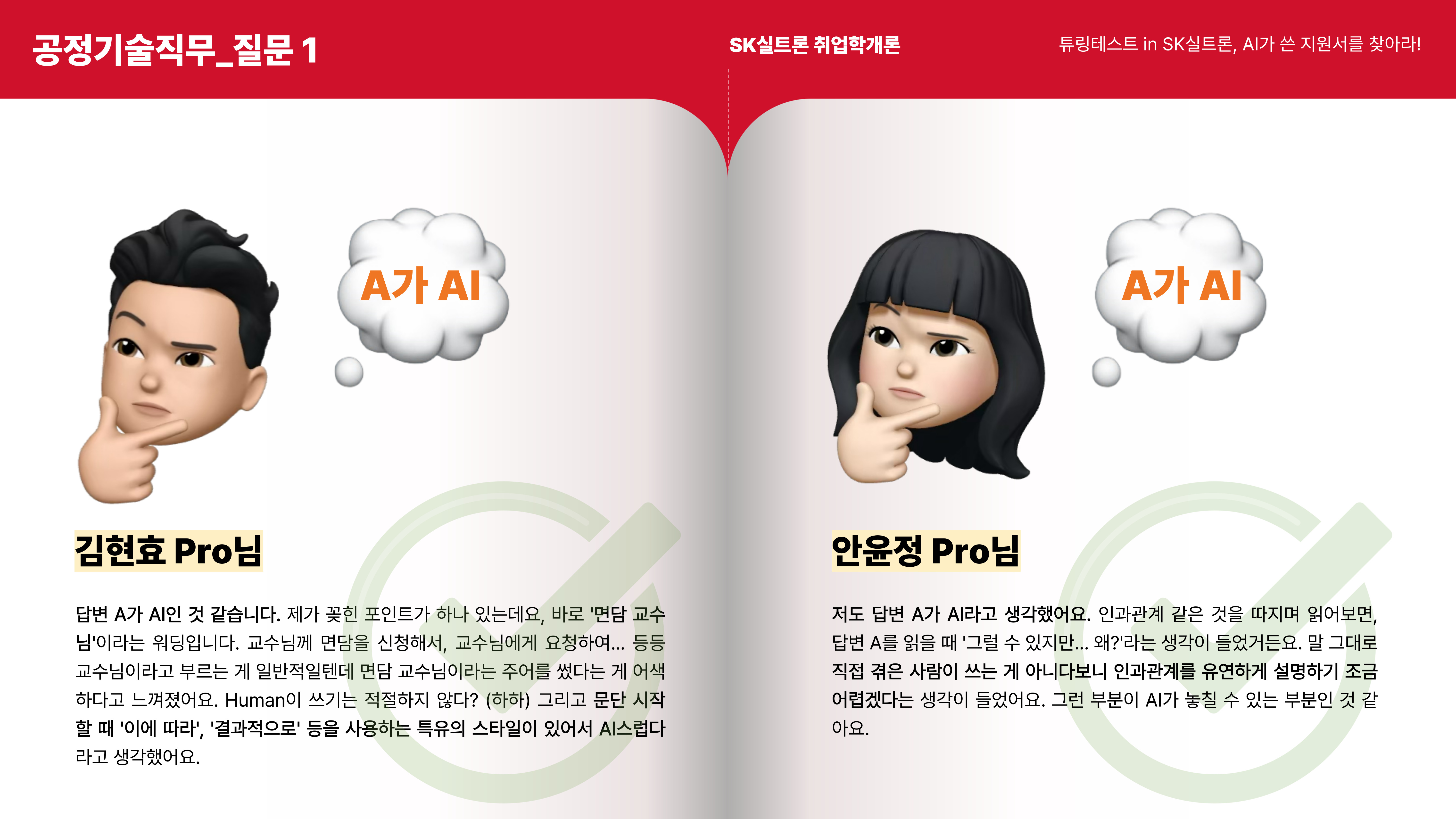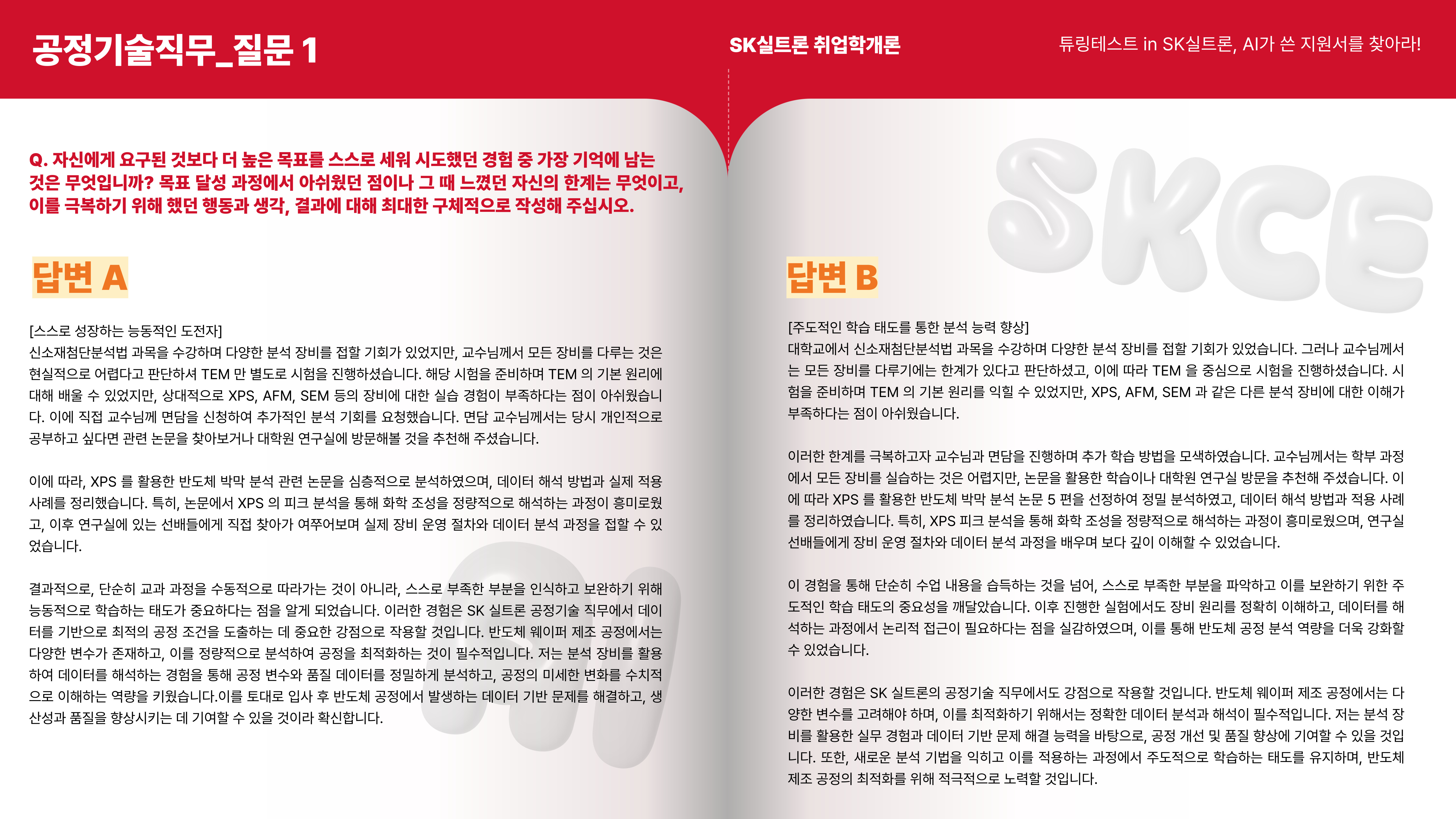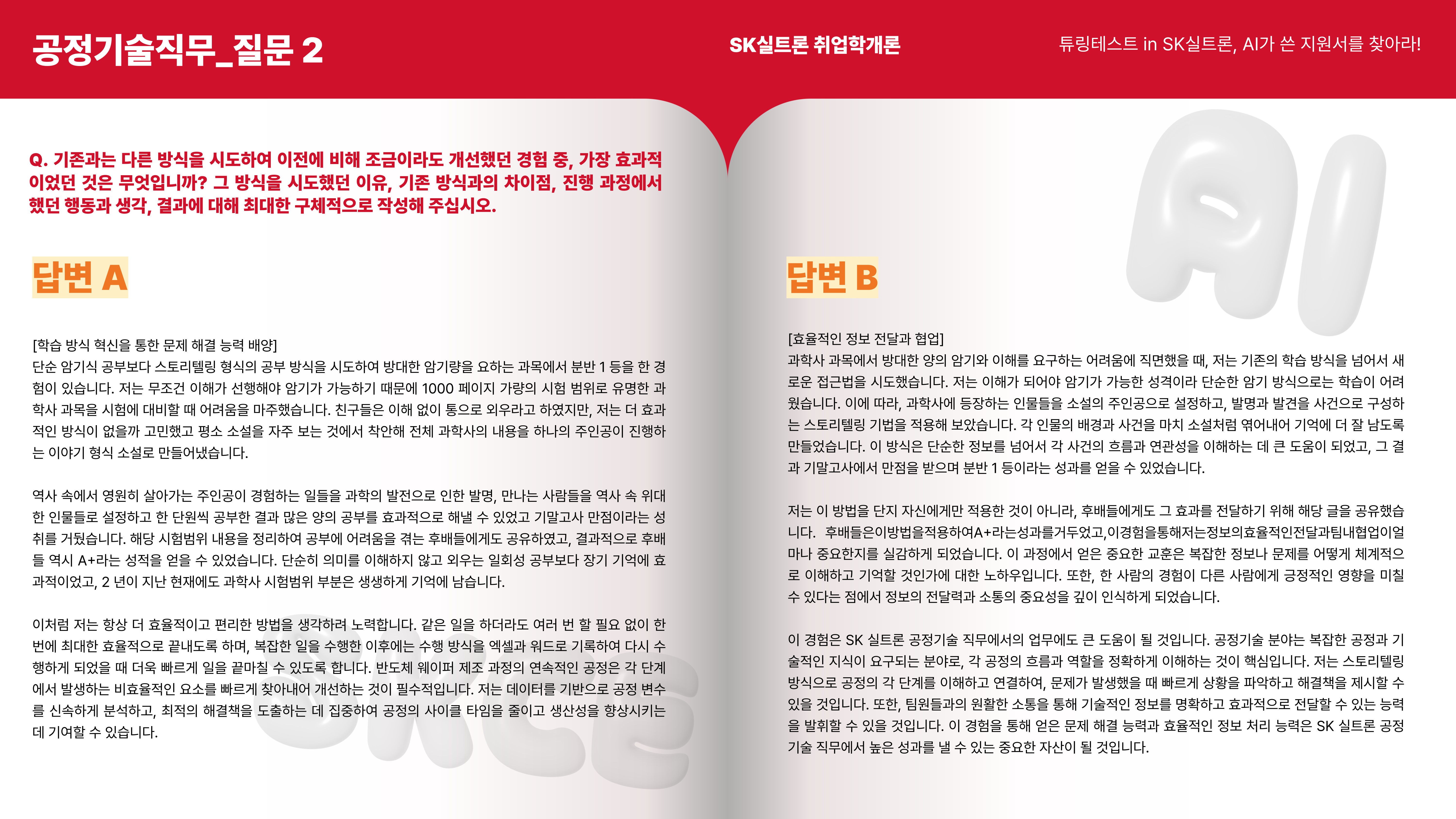 이제 마지막 질문입니다! 공정기술 직무 지원서의 두 번째 질문은 A가 사람, B가 AI 작성 답변입니다.