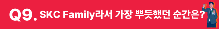 신수흔 매니저 SKC라는 큰 회사의 일원이라는 점 자체가 뿌듯하죠. SK그룹나 SKC에서 마련한 다양한 복지와 시스템을 누릴 수 있는 것도 좋고, 회사에서 직원들의 목소리를 열심히 들으려고 노력해주세요. 그게 느껴질 때마다 '내가 좋은 곳에 왔구나' 싶죠.