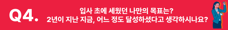 신수흔 매니저 70점짜리 사원이라고 생각해요. 아직 4달차긴 하지만, 담당 지역이 생겨서 팀에 조금이나마 기여할 수 있게 된 것 같아요. 그리고 2년째 아침에 일찍 와서 뉴스를 챙겨보고 업무를 미리 준비하면서 성실한 습관을 들이고 있어요. 배울 자세가 되어 있다는 점에서 긍정적인 평가를 받을 수 있지 않을까요?