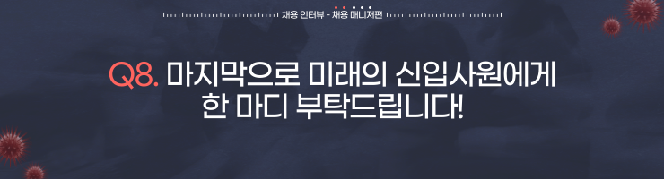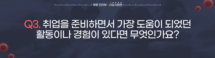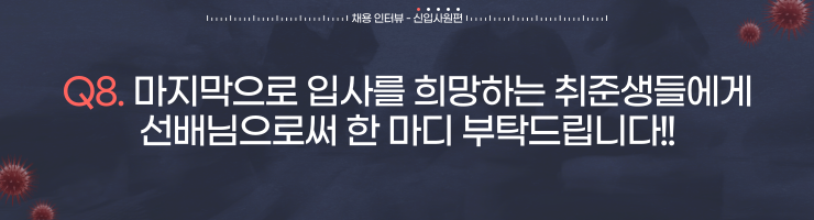 문동진 매니저🍀: 당연하게도 현직실무자의 의견이 아닐까 생각합니다. 입사한 후 회사 내부에서 바라보니, 그만큼 직접적이고 현실적인 정보도 없다는 생각이 들었습니다. 물론 가장 얻기 어려운 정보인 것을 맞지만, 취업박람회나 채용공고사이트에서 정보를 얻고 준비하면 효율적으로 취직준비를 할 수 있지 않을까 생각합니다.