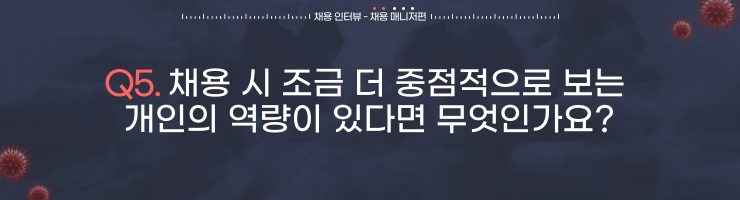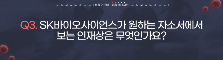 문동진 매니저🍀: 스토리라고 생각합니다.저도 그랬고, 많은 분들이 자기가 했던 많은 일들을 보여줄 거라고 생각합니다. ‘내가 이것도 하고 저것도 했다’라고 나열하는 것 보다는, ‘내가 하고 싶은 일을 위해서 이런 것들을 해봤고, 더 나아가서 저런 것들도 해봤다’ 라는 하나의 흐름을 설명해 주면 더 좋을 것 같습니다. 지내온 시간동안 모두 이미 그런 스토리라인을 가지고 있을 것이라고 생각합니다. 적어도 SK바아오사이언스는 직원 개개인의 커리어와 강점을 잘 고려해주는 회사라고 느끼고 있습니다. 그렇기에 면접과 서류에서 그러한 부분을 잘 보여주면 자신의 강점을 더 잘 드러낼 수 있고, 입사 후에도 강점을 바탕으로 업무를 진행할 수 있는 기회가 있지 않을까 생각합니다.