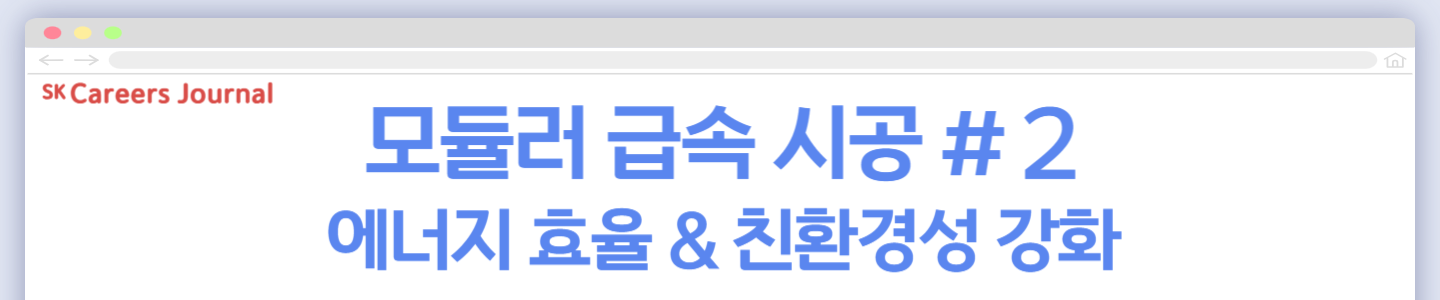 모듈러 시공 방식은 사전에 공장에서 대량으로 생산하는 방식이기에, 현장 작업을 최소화하고 건설 폐기물을 최대 50%까지 감소시킬 수 있습니다. 또한 공장에서 정밀한 모듈 제작을 통하여 단열 성능이 향상되고 냉난방 에너지까지 절감할 수 있다고 합니다. 이외에 태양광 패널, 지열 난방 등 재생에너지에도 쉽게 적용이 가능하여 친환경 건설을 더욱 강화시킬 수 있다는 장점을 가지고 있는 기술입니다.
