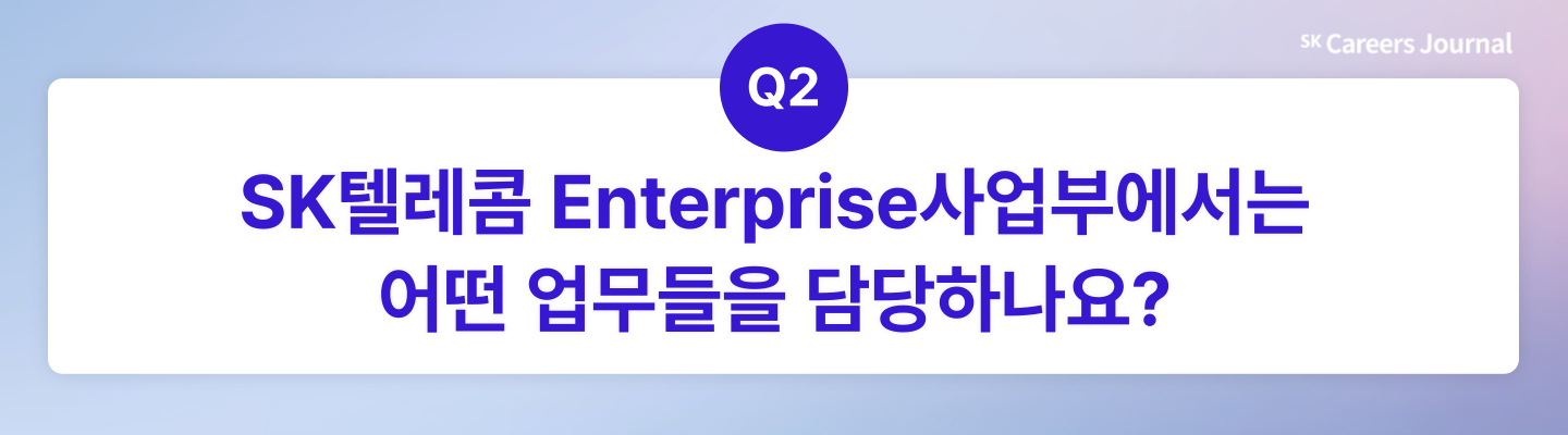 안녕하세요! SK텔레콤 취재기자 김민서입니다. 🎤 이번 콘텐츠에서는 고객과 시장 사이에서 해답을 만들어가는 SK텔레콤 B2B 직무 구성원 세 분을 만나보았습니다.최근 SK텔레콤은 글로벌 AI 컴퍼니로의 도약을 위해 조직을 개편하고, B2B 사업의 전문화를 본격적으로 추진하고 있는데요. 그 중심에는 바로 Enterprise 사업부가 있습니다.