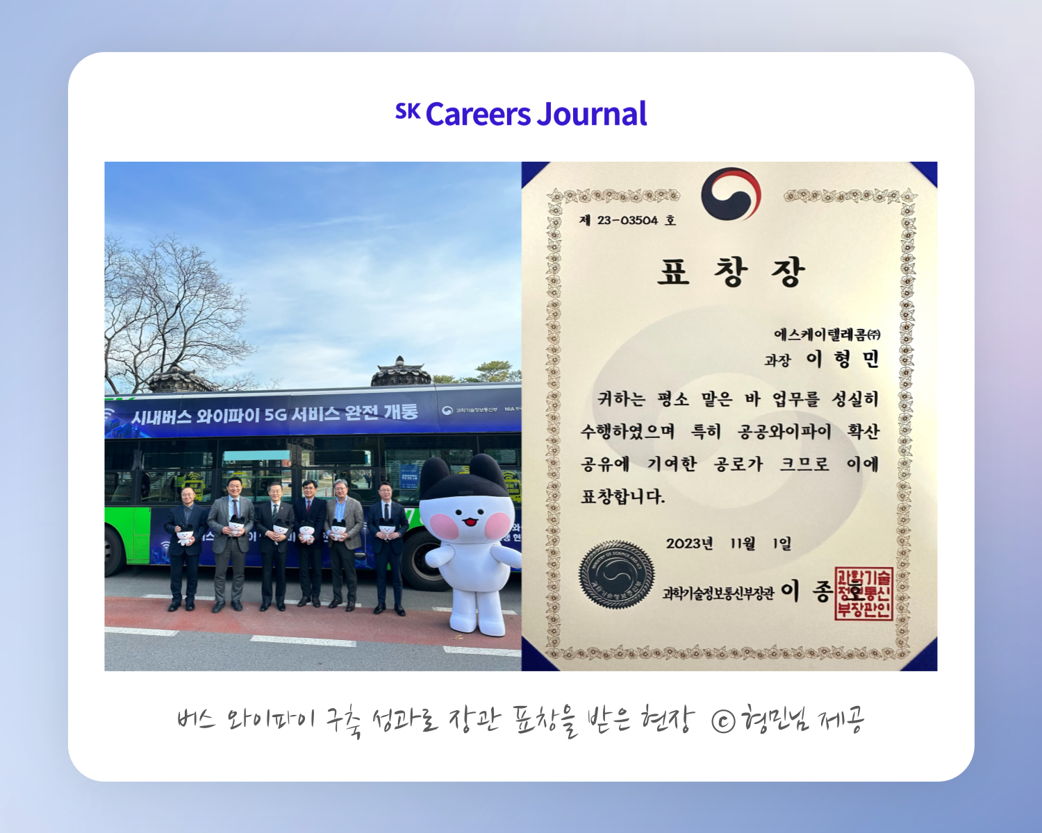 형민님:버스 공공 와이파이 사업을 수주하고 운영을 맡았던 일이 가장 기억에 남습니다. 이전에는 일반 대중이 체감하기 어려운 사업이 많았는데, 이 서비스는 시민들이 직접 이용할 수 있어 더 의미 있었죠. 해당 사업의 일환으로 과학기술정보통신부 장관님이 참석한 행사에 참여한 경험도 있고, 이후 사업 성과를 인정받아 장관 표창을 수상하는 영광도 있었습니다.무엇보다 실제로 지인이나 국민들이 이용하는 버스에서 제가 관여한 서비스가 제공되는 걸 볼 때마다, 실질적인 기여를 하고 있다는 생각이 들어 깊은 보람을 느낍니다.