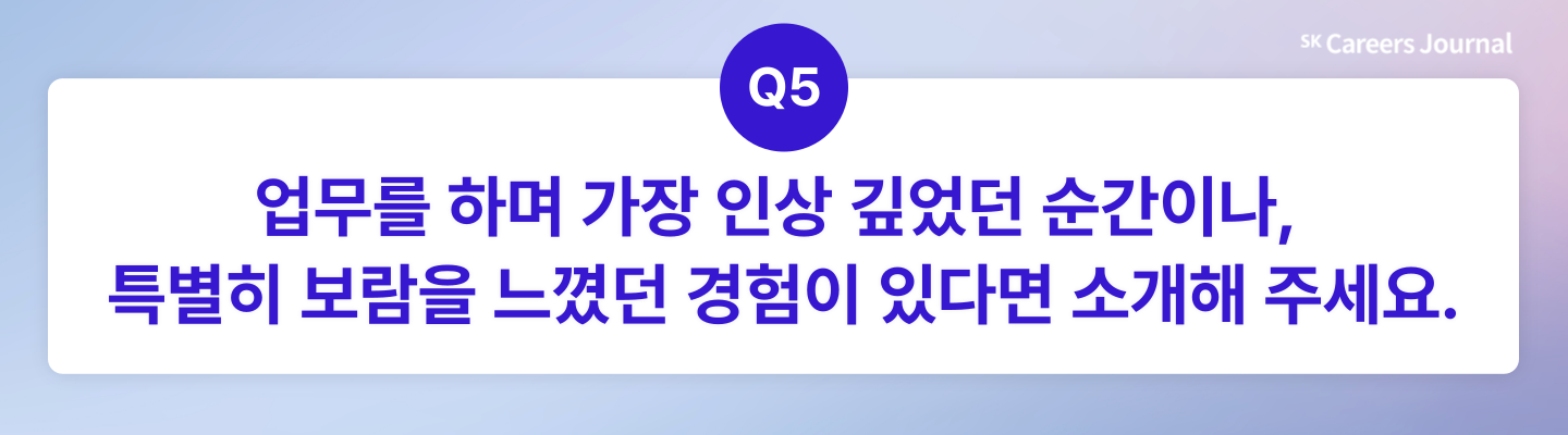 효정님: 입사 첫해에 국내 최초로 도입된 신규 상품 출시 프로젝트에 참여한 적이 있어요. 제 손을 거쳐 새로운 서비스가 세상에 나온다는 사실이 정말 신기했고, 고객사와 논의했던 내용이 실제 기사로 보도됐을 때는 “내가 했던 일이 이렇게 외부에 소개될 수 있구나”라는 생각이 들어, 특히 인상 깊게 기억에 남아 있어요. 또 한 번은 큰 반응이 없던 고객분께 제안을 드렸는데, 나중에 “이건 정말 필요했던 거예요”라고 말씀해주신 적이 있었는데, 그런 순간엔 영업 직무만의 보람을 진하게 느껴졌던 것 같아요.