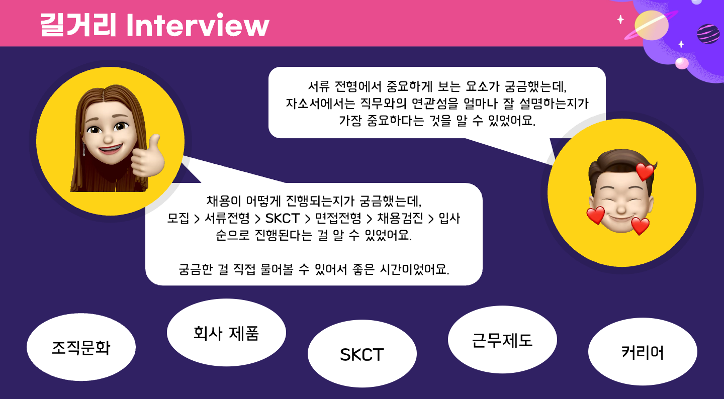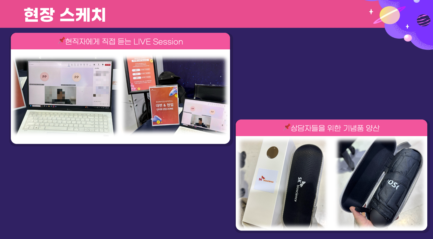 상담 담당자🔎: 현직자 화상인터뷰와 AI매니저 ‘슼매니저’입니다. 현직자를 원격으로 연결하여 실제 하고 있는 업무에 대해 물어보고, 직무를 위해 꼭 필요한 것들을 확인하는 자리였습니다. 그리고 회사에 대한 궁금한 것들을 바로바로 해결하는 AI매니저를 두어, 구직자들이 궁금한 점을 해결할 수 있게 했습니다.