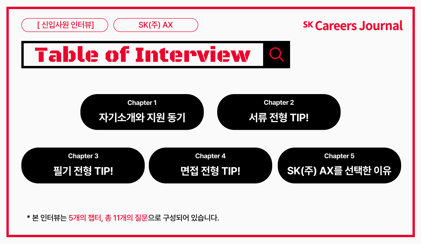 뛰어난 역량을 지닌 두 분의 신입사원께서 SK(주) AX를 택한 이유부터 준비 과정, 면접에서 나를 돋보이게 하는 방법, 새롭게 변화한 AX의 필기와 면접 전형에 대한 팁까지 보다 자세한 내용을 알고 싶으시다면, 지금부터 주목해주세요!!
