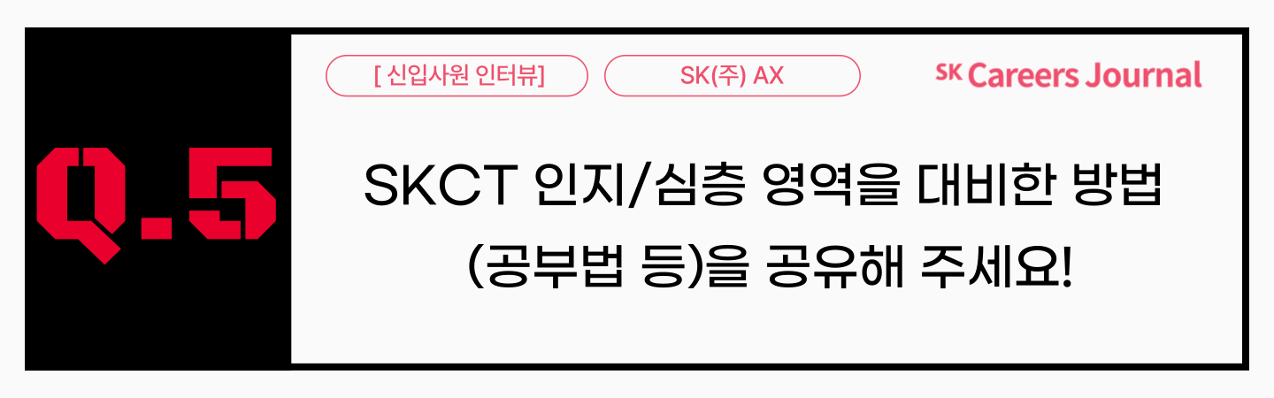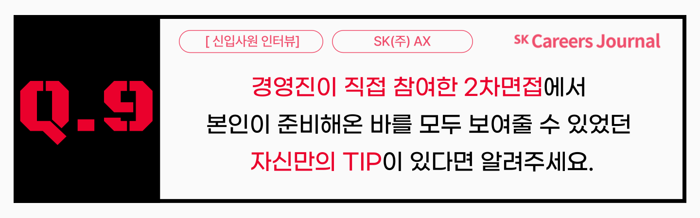지금까지 2024년 SK(주) AX 신입사원 모집을 통해 2025년 신입구성원으로 AX와 함께 함께하게 된 신입사원 두 분과 합격 꿀팁을 주제로 인터뷰를 진행해 보았습니다. 인터뷰에 응해주신 두 분께서 정말 많은 팁을 전수해주고 가셨는데요! 서류 전형에서는 공통적으로 ‘배경-목적-역할-해결과정’ 등과 같이 자신만의 스토리를 통해 역량과 강점을 표현한 점이 차별화된 포인트라고 말해주셨습니다. 필기 전형에서는 SKCT 인지/심층 검사에서 두 분 모두 ‘시간 관리’와 ‘모르는 문제는 과감히 넘기고 최대한 많이 푸는 것’을 기준으로 실전처럼 연습하셨다고 합니다. AICT는 지난 해 처음 도입된 전형으로 정보가 부족하여 준비에 다소 어려움이 있었지만, 전반적으로 신선했고, AI를 어떻게 활용하는지 확인할 수 있어 시대에 맞는 적합한 평가 방식이었다고 평하기도 했습니다. 면접 전형 중 AI면접은 자소서 기반으로 문항이 출제되며, 생각보다 구체적이고 개별화된 질문이 나오기에 꼼꼼한 자기소개서 파악과 더불어 화상 면접 태도에 대한 대비가 중요한 팁이라고 할 수 있겠습니다.