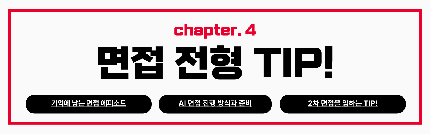 전용호 매니저님) AI 면접은 지원자들이 순서대로 그룹을 나눠서, 각자 PC가 준비된 면접실에 들어가 노트북 앞에서 진행되는 구조였어요. 카메라가 켜진 상태에서 주어진 질문에 대해 약 1분에서 1분 30초간 답변을 하는 방식이었고, 처음에는 그 낯선 분위기에 조금 놀라기도 했어요. 그런데 더 인상 깊었던 건, 자기소개서에 작성한 내용을 바탕으로 지원자마다 개별화된 질문이 주어졌다는 점이었어요. 저는 함축적으로 적었던 자소서의 문장들을 다시 뜯어보면서, 각 문장이 어떤 의미였는지, 왜 그렇게 썼는지에 대한 근거를 명확히 정리해가는 방식으로 준비했었고, 덕분에 질문이 나왔을 때에도 당황하지 않고 제 생각을 논리적으로 설명할 수 있었던 것 같아요.