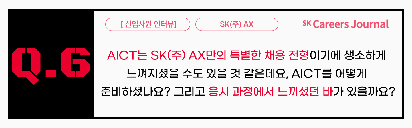 이예은 매니저님) 이번 채용에 함께하신 분들도 비슷하게 느끼셨겠지만, AICT가 이번에 처음 도입된 전형이어서 사전에 참고할 수 있는 정보가 거의 없었습니다. 그래서 저는 별도의 구체적인 대비보다는 마음의 준비..정도만 했던 것 같습니다. AICT는 신선하고 재밌는 경험이었습니다. AICT 시작 시간 직전까지 긴장이 많이 되었는데, 걱정했던 것에 비해 어렵지 않았고 사전에 연습문제로 받았던 문항들과 유사한 난이도였던 것 같습니다. 본시험 시작 후에는 챗GPT를 사용해 논문을 작성했던 경험을 기반으로 차분하게 AICT에 임하자는 생각으로 시험시간 1시간을 보냈습니다. 직접 AI를 활용해 문제를 해결하는 과제가 주어진 점이 신선했고, 이를 통해 SK(주) AX가 실제 업무에 AI 기술을 적극적으로 활용하고자 한다는 점을 체감할 수 있었습니다.