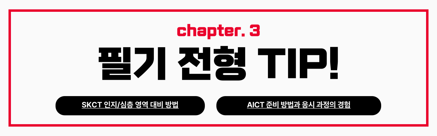이예은 매니저님) 저는 SKCT는 문제를 짧은 시간 내에 정확하게 푸는 것이 중요하다고 생각했기 때문에, 연습할 때부터 실전처럼 훈련하려 노력했습니다. SKCT는 온라인 검사로 진행되기에 인지 영역 문제 풀이도 eBook을 활용해 온라인 환경에서 연습해 보았습니다. 또 시간 관리 연습에도 집중했습니다. 기출 문제를 실제 시험 시간에 맞춰 시간 제한을 두고 풀었고, 풀이 시간이 길어질 것 같은 문제는 과감히 넘어가는 전략도 함께 연습했습니다. 이러한 연습을 충분히 해두었던 덕분에 시험 당일에도 당황하지 않고 자신의 실력을 온전히 발휘하실 수 있었다고 생각됩니다.