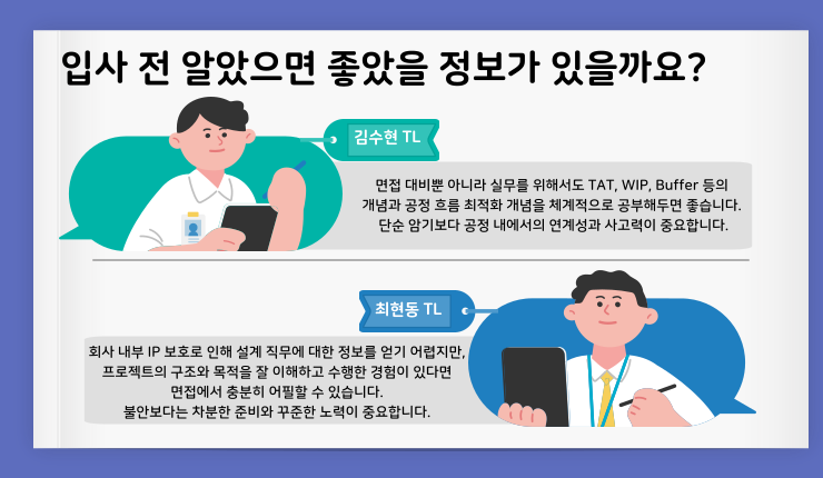 김수현 TL : 입사 전에는 면접에서 전공 지식뿐만 아니라 반도체 공정에 대한 기초적인 이해를 묻는 질문이 나온다는 것을 미리 알았더라면 준비하는 데 훨씬 도움이 되었을 것 같습니다. 면접에서는 단순히 이론적인 지식을 묻는 것을 넘어, 그것을 반도체 생산 과정과 어떻게 연결 지을 수 있는지에 대한 사고력을 중요하게 보는 것 같았습니다.