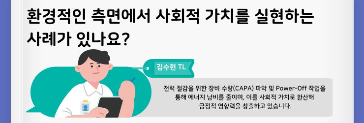 김수현 TL : 환경적인 측면에서는 전력 사용량을 줄이는 활동을 들 수 있을 것 같습니다. 특히 여름철에는 국가적으로 전력난이 중요한 이슈가 되는데, 이때 전력 소비를 줄이는 것은 기업 입장에서도 비용 절감에 도움이 되고, 사회 전체적으로도 긍정적인 영향을 주는 일이라고 생각합니다.