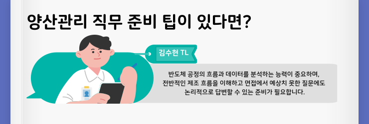 김수현 TL : 양산 관리 직무에 관심 있는 취업 준비생분들께는 산업공학 전공 지식뿐만 아니라, 반도체 공정에 대한 기초적인 이해도 함께 준비하시길 추천해 드립니다. 데이터 분석 능력은 기본이고, 여기에 반도체가 어떤 과정을 통해 만들어지는지에 대한 전반적인 흐름을 알고 가시면 면접에서도 훨씬 수월하게 대응하실 수 있습니다. 예를 들어, 웨이퍼가 무엇인지, 포토 공정이나 식각(에칭) 공정처럼 반도체 제조를 이루는 주요 단계를 이해해 두시면 예상치 못한 질문에도 침착하게 답변하실 수 있을 것입니다.