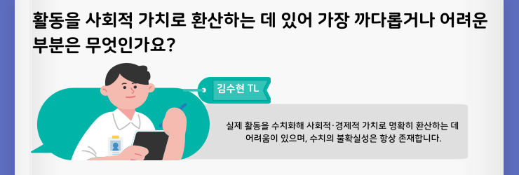 김수현 TL : 현업에서 수행하는 업무를 사회적 가치나 경제적 가치로 환산할 때 가장 어려운 점은, 아무래도 산출된 값이 엄밀히 말하면 '추정값'이라는 점입니다. 물론 구체적인 Logic를 기반으로 환산한 수치이기는 하지만, 실제로 그 활동이 해당 사회적·경제적 가치를 완전히 실현했는지 사후에 정확하게 확인할 방법이 없기 때문에 항상 약간의 불확실성은 존재합니다.