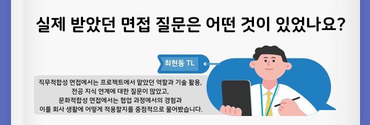 최현동 TL : 실제 면접에서는 직무적합성 면접과 문화적합성 면접으로 나누어 질문을 받았습니다.