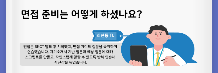 최현동 TL : 저는 SKCT 시험이 끝난 직후부터 전공 관련 공부를 꾸준히 이어갔고, 본격적인 면접 준비는 SKCT 발표 이후에 시작하였습니다. 면접은 마지막 관문이라는 생각이 강하게 들었고, 다른 전형에 비해 다소 생소하게 느껴져 준비 과정이 쉽지는 않았습니다.