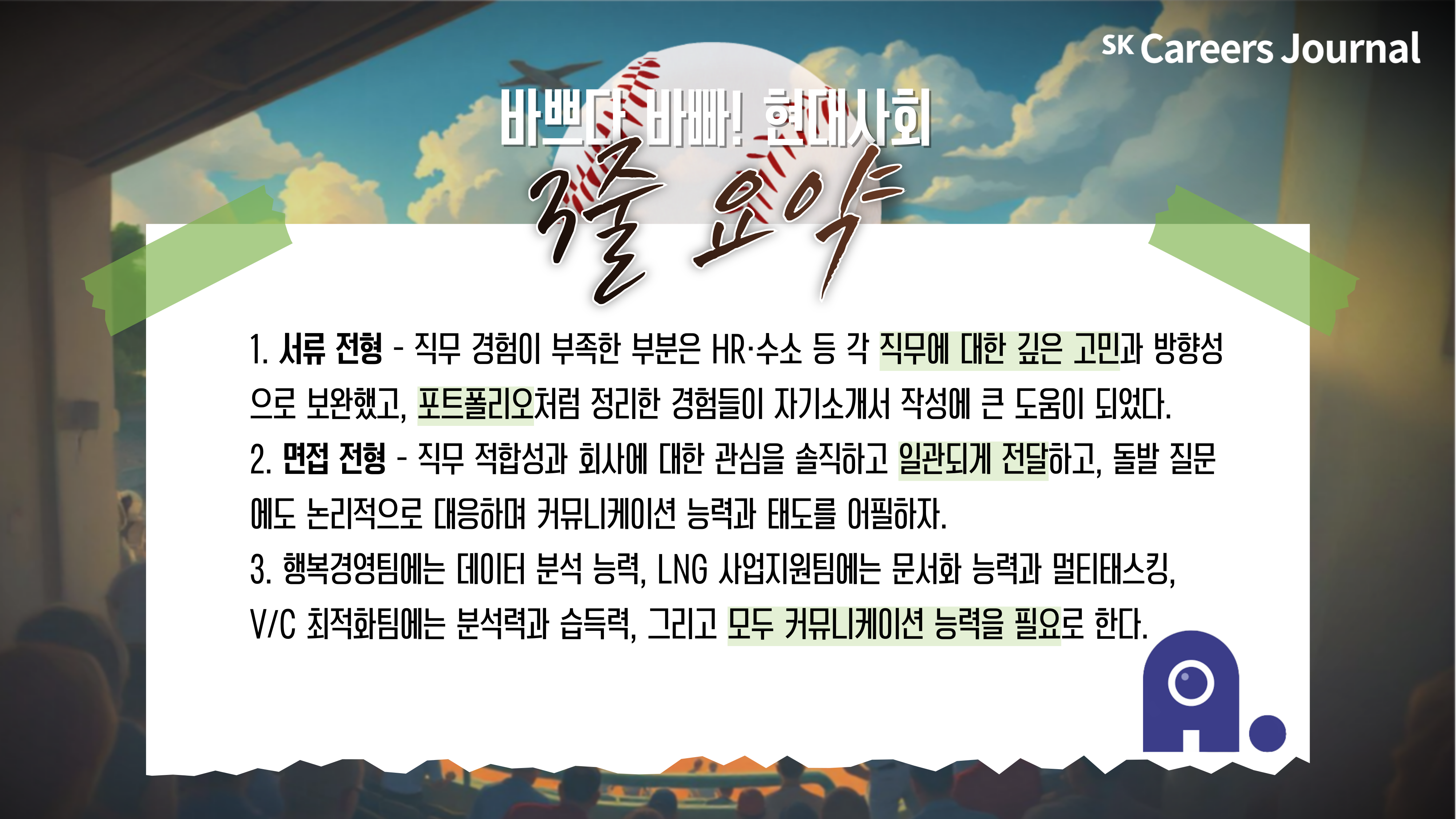 그래서 준비했습니다! 이 치열한 과정을 뚫고 ‘합격’이라는 홈플레이트에 안착한 신입사원들✨ 실패도 있었고, 시행착오도 있었지만 결국 ‘결정타’를 날린 매니저님들의 생생한 꿀팁을 전해드립니다.💬⚾