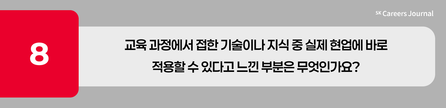 지난 기사에서는 SKALA 담당자 인터뷰를 통해 프로그램의 목표와 운영 방식 등을 살펴보았는데요. 이번 기사에서는 담당자가 아닌 교육생들의 인터뷰를 통해, 실제 교육 현장에서는 어떤 경험들이 이루어지고 있는지, 그들이 어떻게 배우고 성장했는지, 그리고 SKALA가 실무 역량 향상에 어떤 영향을 미쳤는지 들어보겠습니다.