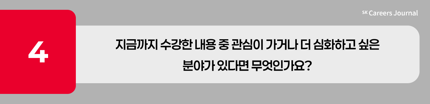 본 인터뷰를 통해, SKALA는 일반적인 강의들과는 다르게, 실무에서 활용할 수 있는 역량을 기를 수 있도록 섬세하게 설계된 프로그램임을 확인할 수 있었습니다. 교육생들은 SKALA를 통해 이론 학습을 넘어 직접 프로젝트를 수행하며 실무 감각을 익히고, 문제 해결 능력을 키울 수 있었다고 말합니다.