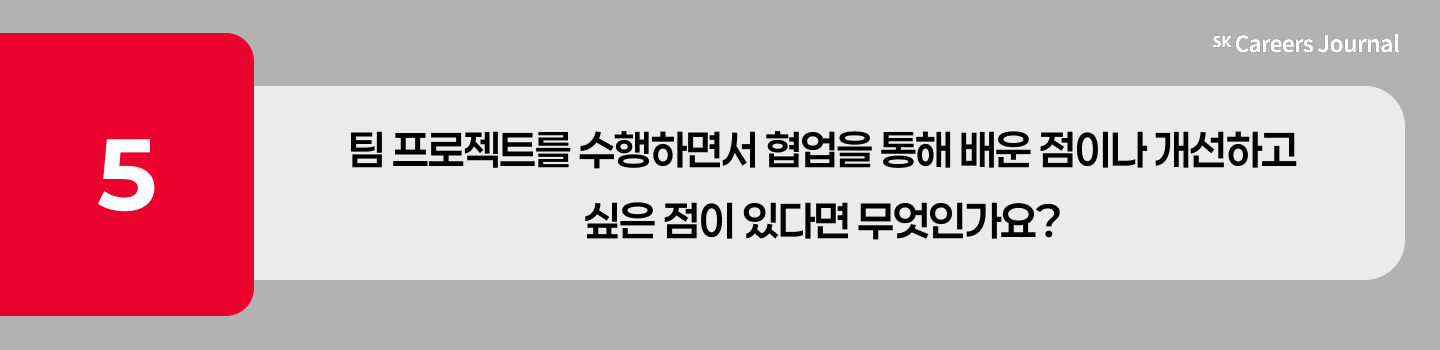 팀원들의 다양한 강점을 살려 각자 맡은 바를 수행하며 항상 재미있게 팀 프로젝트를 해왔습니다. 이를 통해 개개인의 강점을 살리고 서로의 역할을 존중하는 것이 중요하다는 것을 배울 수 있었습니다. 또한 팀 내에서의 소통 뿐 아니라 외부와의 소통 또한 중요함을 느낄 수 있었습니다. 팀에서 만든 프로젝트 산출물에 대한 발표를 끝낸 후 돌아보면 좀 더 조리있고 깔끔하게 말할 걸 이라는 생각이 들 때가 많습니다. 앞으로는 더 명확하고 설득력있는 발표를 할 수 있도록 연습해 나가고 싶습니다.
