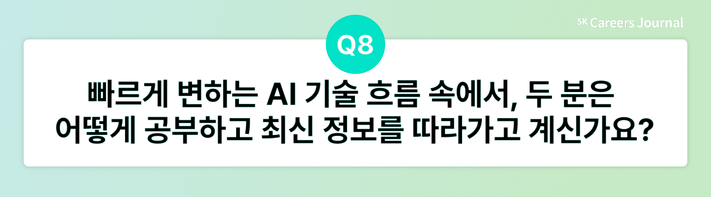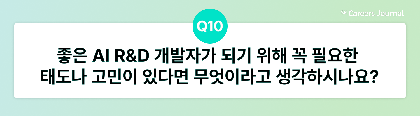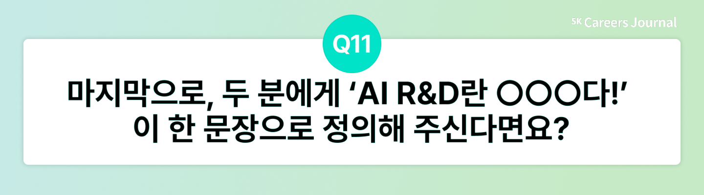 AI R&D 개발자의 여정은 언제나 ‘더 나은 기술을 위한 고민’의 연속이었습니다. 정해진 답이 없기에 더 치열하고, 매 순간이 선택의 연속이기에 더 의미 있는 일! 이번 인터뷰가 AI R&D 직무를 고민하는 분들께 조금 더 구체적인 상상과 든든한 동기 부여가 되었기를 바랍니다.
