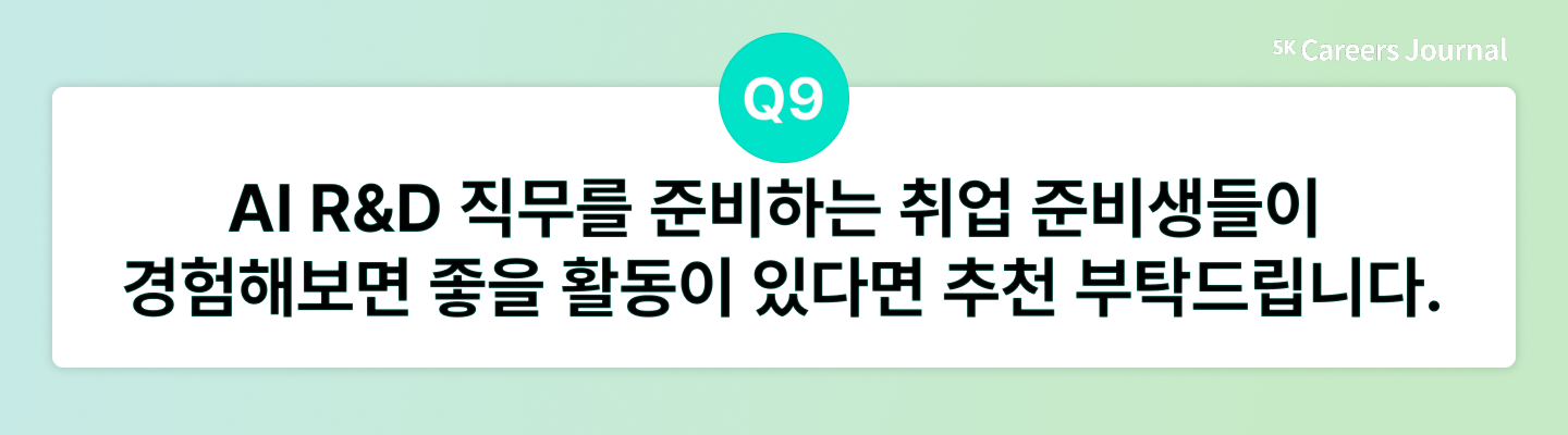 재경님: 많은 분들이 ‘논문이 없으면 R&D 취업이 어렵냐’고 묻는데, 저는 논문 자체보다 그 과정을 경험해보는 게 훨씬 중요하다고 생각해요. 결국 논문도 하나의 프로젝트거든요. AI 모델을 기획하고, 실험을 설계하고, 그 결과를 논리적으로 정리하는 일련의 과정을 해보는 것 자체가 훌륭한 훈련이 됩니다. 논문이 없어도 괜찮으니, 대신 다양한 프로젝트를 경험하고, 그 완성도를 높이는 데 집중하셨으면 좋겠어요. 그렇게 쌓은 경험들이 나중에 훨씬 더 설득력 있는 포트폴리오가 될 거라고 생각합니다.