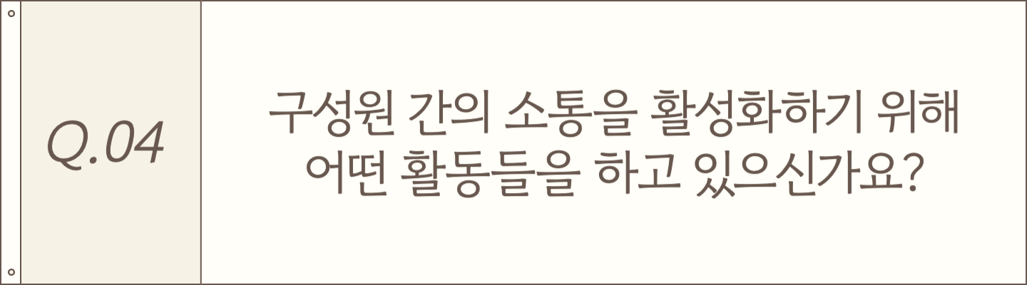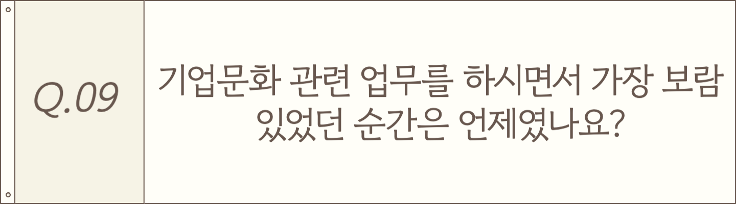 저는 기본적으로 사람을 좋아하는 편인데요, 그래서인지 교육이나 프로그램, 행사를 기획했을 때 구성원분들이 “이런 걸 만들어줘서 고맙다”라고 말씀해주실 때 가장 보람을 느껴요. 특히 어떤 프로그램이 끝난 후에 “다음에는 언제 하나요?”라고 물어봐 주실 때, 정말 큰 동기부여가 됩니다. 거창하진 않지만, 그런 따뜻한 피드백이 저에게는 지속적으로 이 일을 해나갈 수 있는 원동력이 되는 것 같아요.