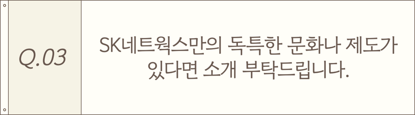 SK의 기업문화를 말할 때는 SKMS를 빼놓을 수 없을 것 같은데요, SKMS는 SK 경영의 핵심 경영이념이자 기업문화로, 구성원의 행복을 가장 중요한 가치로 보고 있습니다. 자연스레 이러한 방향으로 조직 문화나 제도들이 자연스럽게 만들어져 있다는 것을 실제로 일하면서 많이 느끼고 있습니다.