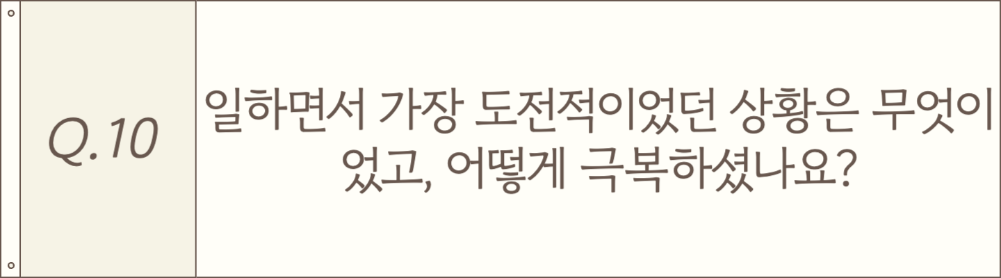 그래서 현재는 구성원들과 함께 “진짜 우리가 원하는 효율성은 무엇일까?”를 고민하면서, 변화에 대한 심리적 허들을 낮추는 데 집중하고 있습니다. 이 과정을 통해 모두가 변화에 자연스럽게 적응할 수 있도록 돕는 것이 지금 저에게 가장 큰 도전입니다!