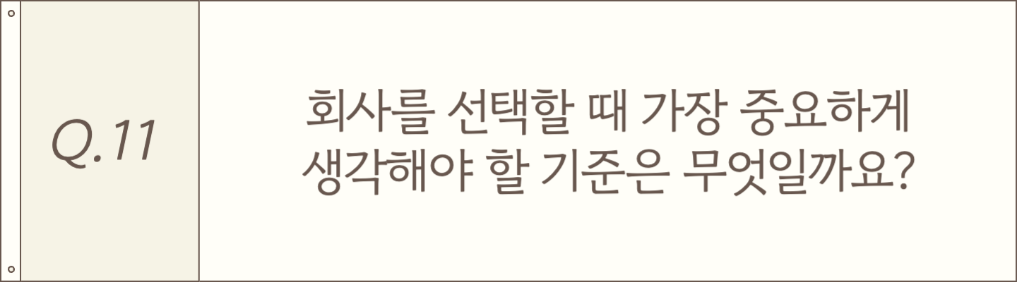 본인이 어떤 직무를 원하는지, 그 일을 통해 어떤 가치를 얻고 싶은지를 충분히 고민해 보셨으면 좋겠습니다. 결국 입사 후에 내가 하는 일에 의미를 느끼지 못하면 만족하기 어렵거든요. 자신이 진짜 하고 싶은 일이 무엇인지, 그 안에서 의미를 찾을 수 있을지를 기준으로 회사를 바라보는 게 가장 중요하다고 생각합니다.