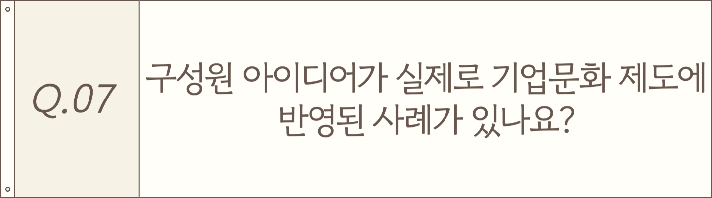 구성원의 의견은 항상 적극적으로 반영하려고 노력하고 있습니다. 대표적인 예로, 매년 진행하는 '컬처 서베이'를 통해 구성원들의 다양한 의견을 수렴하고 있는데요, 한 사우분께서 “회사의 방향성에 대해 더 자주 공유받고 싶다”는 의견을 주신 바 있습니다. 이 피드백을 바탕으로 매달 세번째 금요일 ‘커넥트 타임’을 마련하게 되었습니다. ‘커넥트 타임’에서는 경영 실적이나 제도 변화 등 회사의 주요 이슈를 투명하게 공유할 뿐만 아니라, 특성 있는 업무에 대한 소개와 구성원 간의 경험 공유도 이루어지고 있어 소통의 장으로 활용되고 있습니다.