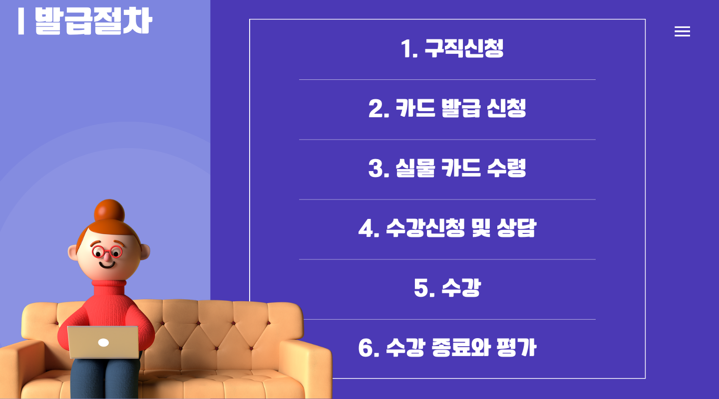 다음은 발급절차입니다. 국민내일배움카드 발급은 온라인으로 가능한데요. 발급부터 신청까지 천천히 알아보겠습니다.