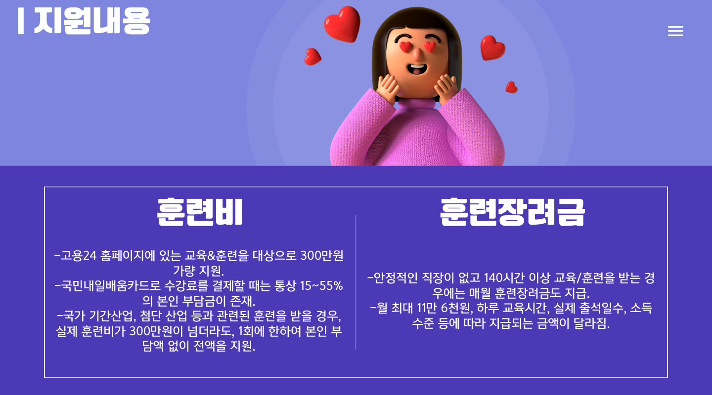 다음으로는 아주 중요한 내용인 지원내용에 대하여 알아볼 텐데요. 첫 번째는 훈련비, 두 번째는 훈련장려금입니다
