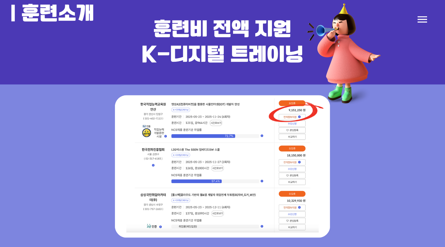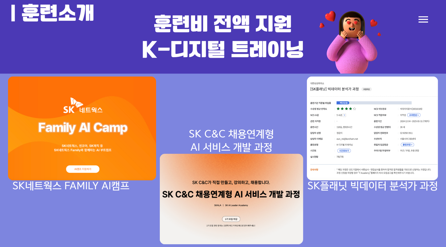 또한 이전 말씀드린 K-디지털 트레이닝도 확인할 수 있었는데요. 상당한 금액의 훈련을 무료로 수강할 수 있는 기회, 놓치면 안되겠죠?