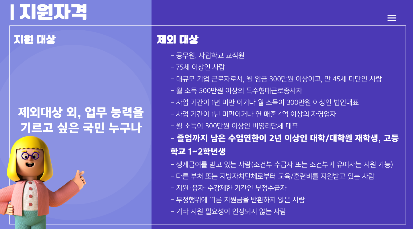 우선 지원 자격부터 살펴보겠습니다. 국민내일배움카드는 업무 능력을 키우고자 하는 누구나 발급을 받을 수 있는데요. 단, 특정 조건에 해당하는 분들은 발급 대상에서 제외됩니다. 그렇다면 제외대상을 한 번 보시겠습니다.