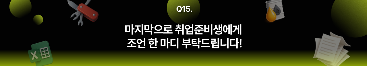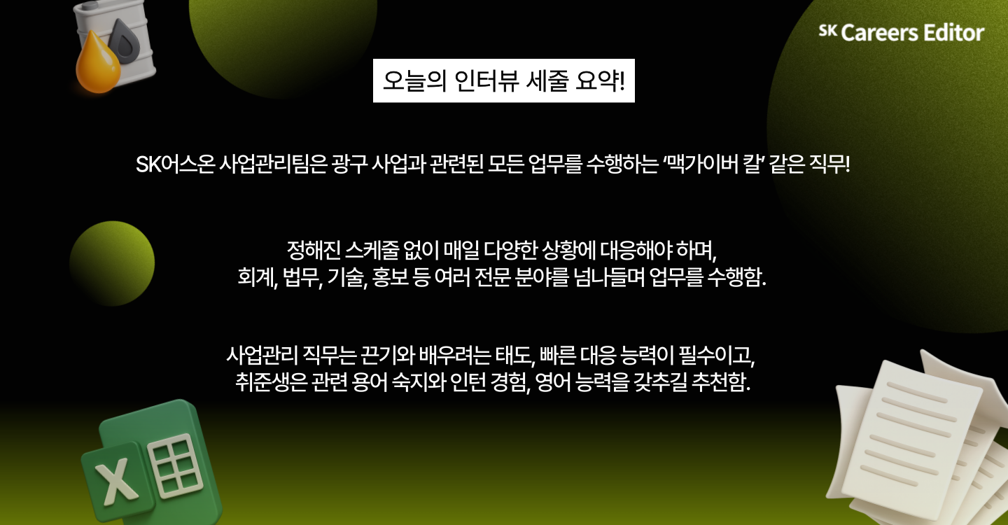 제일 중요한 건 ‘꺾이지 않는 마음’인 것 같아요. 서류 탈락한다고 해서 인생이 끝나는 건 아니잖아요. 저도 실제로 SK어스온 빼고는 다 떨어졌었어요. 면접까지 갔던 곳도 어스온 하나밖에 없었고, 결국 최종 합격한 곳도 어스온이었어요. 일단은 끝까지 계속 도전해 보셨으면 좋겠어요. 사업관리 직무가 듣기에는 여러 가지를 다 해야 해서 막연하게 어렵게 느껴질 수도 있지만, 막상 해보면 재미도 있고, 본인이 성장하는 게 눈에 보이는 직무이기도 합니다. 특히 내가 하는 일이 ‘결과’로 바로바로 드러나는 직무 중 하나라고 생각해요. 다양한 분야를 두루 접하면서 성장하고 싶은 분들이라면 꼭 한 번쯤 도전해 보셨으면 좋겠습니다!