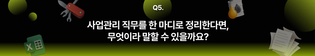 ‘맥가이버 칼’이라고 표현할 수 있을 것 같아요. 각 기능이 하나하나 완벽하진 않지만, 꼭 필요한 순간에 어떤 상황이든 대응할 수 있는 다재다능함이 핵심이거든요. 사업관리 직무도 마찬가지입니다. 법무팀처럼 법적 전문성은 깊지 않아도 계약서를 검토할 수 있고, 회계팀처럼 숫자에 특화되어 있진 않아도 손익을 분석할 수 있으며, PR팀만큼 홍보에 정통하진 않아도 대외 커뮤니케이션을 맡아야 하죠. 모든 전문 영역과 맞닿아 있으면서, 그 중간에서 유기적으로 연결하고 조율하는 직무가 바로 사업관리라고 생각합니다.