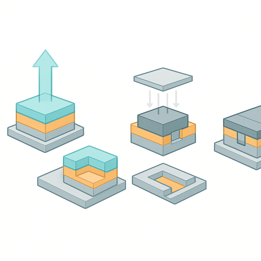* Photolithography(포토 공정)은 회로 패턴을 웨이퍼 위에 빛을 이용해 그려내는 공정입니다. 미세한 패턴을 고해상도로 정확히 전사하는 것이 핵심이며, 반도체 성능에 큰 영향을 미치는 만큼 매우 정밀한 기술이 요구됩니다. * Etch(식각 공정)은 포토 공정으로 형성된 패턴을 기준으로, 불필요한 부분을 화학적 또는 물리적으로 제거하는 공정입니다. 패턴의 형상이 무너지지 않도록 세밀한 조건 제어가 중요합니다. * Ion Implant & Diffusion(이온 주입 및 확산 공정)은 웨이퍼에 이온을 주입하거나 고온에서 확산시켜 전기적 특성을 부여하는 과정입니다. 이 공정을 통해 반도체가 전류를 제어할 수 있는 기능을 갖추게 됩니다. * Thinfilm(박막 공정)은 금속이나 절연 물질 등을 아주 얇게 증착해 회로의 층을 형성하는 과정입니다. 적절한 두께와 균일성이 확보되어야 회로가 안정적으로 동작할 수 있습니다. * Cleaning & CMP(세정 및 연마 공정)은 웨이퍼 표면의 이물질을 제거하거나, 회로를 쌓기 전 표면을 평탄하게 만드는 공정입니다. 작은 입자나 오염이 수율에 영향을 줄 수 있기 때문에 매우 중요한 단계입니다.