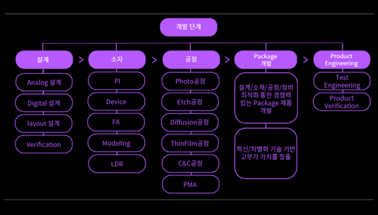 * PI(Process Integration):여러 공정을 하나의 흐름으로 연결해 최적의 결과를 만들어냅니다. * Device:트랜지스터 같은 기본 전자소자를 설계하고 분석합니다. * FA/CA:소자 및 Chip 단위의 불량이 생겼을 때 원인을 분석해 개선 방향을 찾습니다. * TCAD:공정이나 소자를 시뮬레이션으로 실험하는 소프트웨어를 다룹니다. * Modeling:반도체 소자 modeling을 통해 생산성 향상 및 성능개선 업무 수행합니다. * LDR(Layout Design Rule): 미세 공정에서 회로 설계를 최적화하기 위한 규칙을 정합니다.