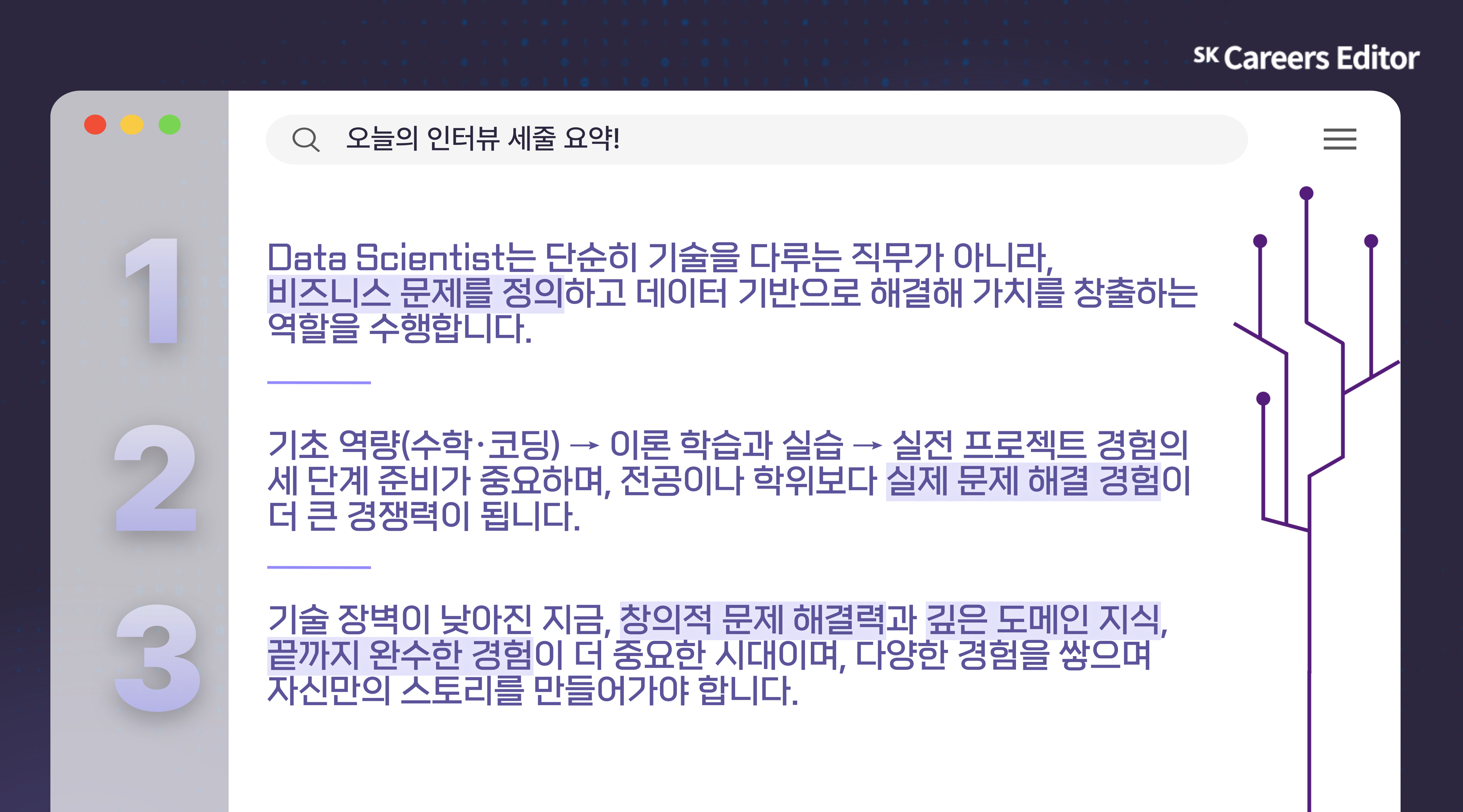 Data Scientist는 비즈니스 문제를 데이터 기반으로 정의하고 창의적으로 해결해 새로운 가치를 창출하는 역량이 핵심인 직무입니다. 최근에는 온라인 강의나 오픈소스 자료 등을 통해 학문적인 접근이 쉬워졌고, 생성형 AI와 같은 도구의 등장으로 분석에 대한 기술적인 장벽 또한 낮아지며 이제는 깊이 있는 도메인 지식, 창의적인 문제 해결 능력, 그리고 전 과정을 끝까지 완수하는 끈기가 더욱 중요해지고 있습니다. 교과서적인 지식에 머무르기보다는 공모전, 인턴십 등을 통해 현장의 복잡하고 비정형적인 문제에 직접 부딪쳐 보시길 추천합니다. 실패도 많이 겪어보시고, 그 과정에서 여러분이 어떤 문제를 어떻게 해결했는지, 어떤 가치를 만들어냈는지를 중심으로 자신만의 스토리를 꼭 만들어 보세요. AI와 DT로 혁신을 추구하는 SK이노베이션 같은 곳에서 여러분의 Data Science 역량이 마음껏 발휘되기를, 진심으로 응원합니다!