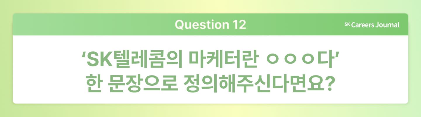 세모님:SK텔레콤의 마케팅 업무는, 제가 맡은 일이 가족과 친구를 포함한 많은 사람의 일상에 직접 영향을 미치고, 그 반응을 바로 체감할 수 있다는 점에서 정말 특별하고 의미 있다고 생각해요. 변화와 트렌드를 즐기고, 빠른 호흡의 업무를 좋아하는 분이라면 잘 맞을 거예요. 저는 ‘똑똑한 사람보다 꾸준히 준비한 사람이 이긴다’는 말을 믿는 편인데요. 여러분도 자신만의 속도로 차근차근 준비해 오셨다면, 분명 좋은 결과가 있을 거예요. 곧 함께 일할 수 있는 날이 오기를 기대합니다.