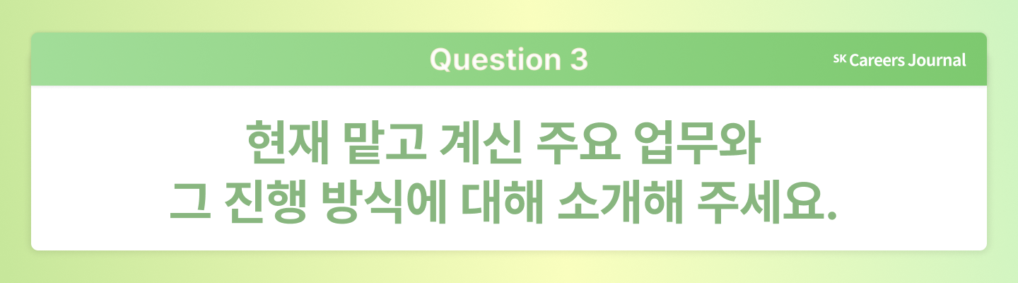 수한님: SK텔레콤에서는 빠르게 변화하는 시장 흐름 속에서 늘 새로운 과제를 마주하고, 이를 해결해 나가는 과정에서 역동적인 경험을 쌓을 수 있습니다. 무엇보다 나이와 경력에 상관없이 구성원의 의견을 존중하는 문화가 깊게 자리 잡고 있다는 점이 분명한 장점입니다. 자신만의 주관과 방향성을 가지고 주도적으로 일하고 싶은 분이라면, 도전해 보시기를 바랍니다.