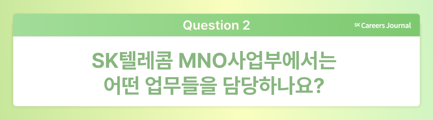 수한님: SK텔레콤의 MNO 서비스는 전 국민 절반 이상이 사용하는 핵심 서비스입니다. 이를 안정적으로 제공하기 위해, MNO사업부는 마케팅 기획부터 시장 및 외부 변수 대응, 상품과 혜택 설계까지 다양한 업무를 수행하고 있습니다. 조직 별 역할은 다르지만, 궁극적으로는 고객에게 최고의 통신 서비스를 제공한다는 공통된 목표를 향해 함께 나아가고 있습니다.