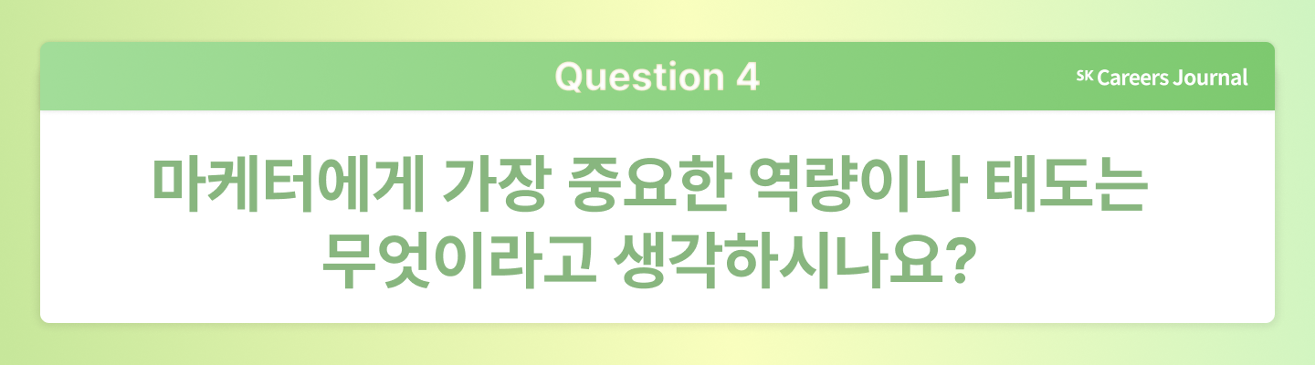 세모님: 마케터에게는 유연하면서도 단단한 사고가 꼭 필요하다고 생각합니다. 마케팅은 수백 가지 방법론이 존재하는 정답이 없는 영역이기 때문에, 열린 시선으로 다양한 시도와 의견을 수용하는 태도가 중요하죠. 동시에, 어떤 목표를 향해 나아가야 하는지 명확히 알고 끝까지 중심을 지키는 단단함도 필요합니다.