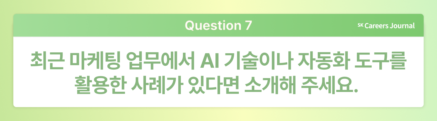수한님: 저는 공과대학에서 산업공학을 전공했고, 졸업 전까지는 학업과 인턴 활동 대부분을 데이터 엔지니어로 경험했습니다. 그 과정에서도 컨설팅이나 마케팅에 대한 열망이 늘 있었는데요, 마지막 인턴 동료가 SK텔레콤 마케팅 직무를 추천해준 것이 큰 계기가 됐습니다. 조직 문화와 복지, 다양한 업무 영역이 매력적이라는 설명을 듣고 자연스럽게 관심이 생겼고, 이후 통신과 마케팅을 공부하면서 이 직무에 지원하게 되었습니다. 데이터 역량을 바탕으로 분석에 강점을 지닌 스페셜리스트형 마케터로 성장하고 싶다는 목표도 있었기에, 지금 이 자리에서 일할 수 있다는 점이 감사하게 느껴집니다.