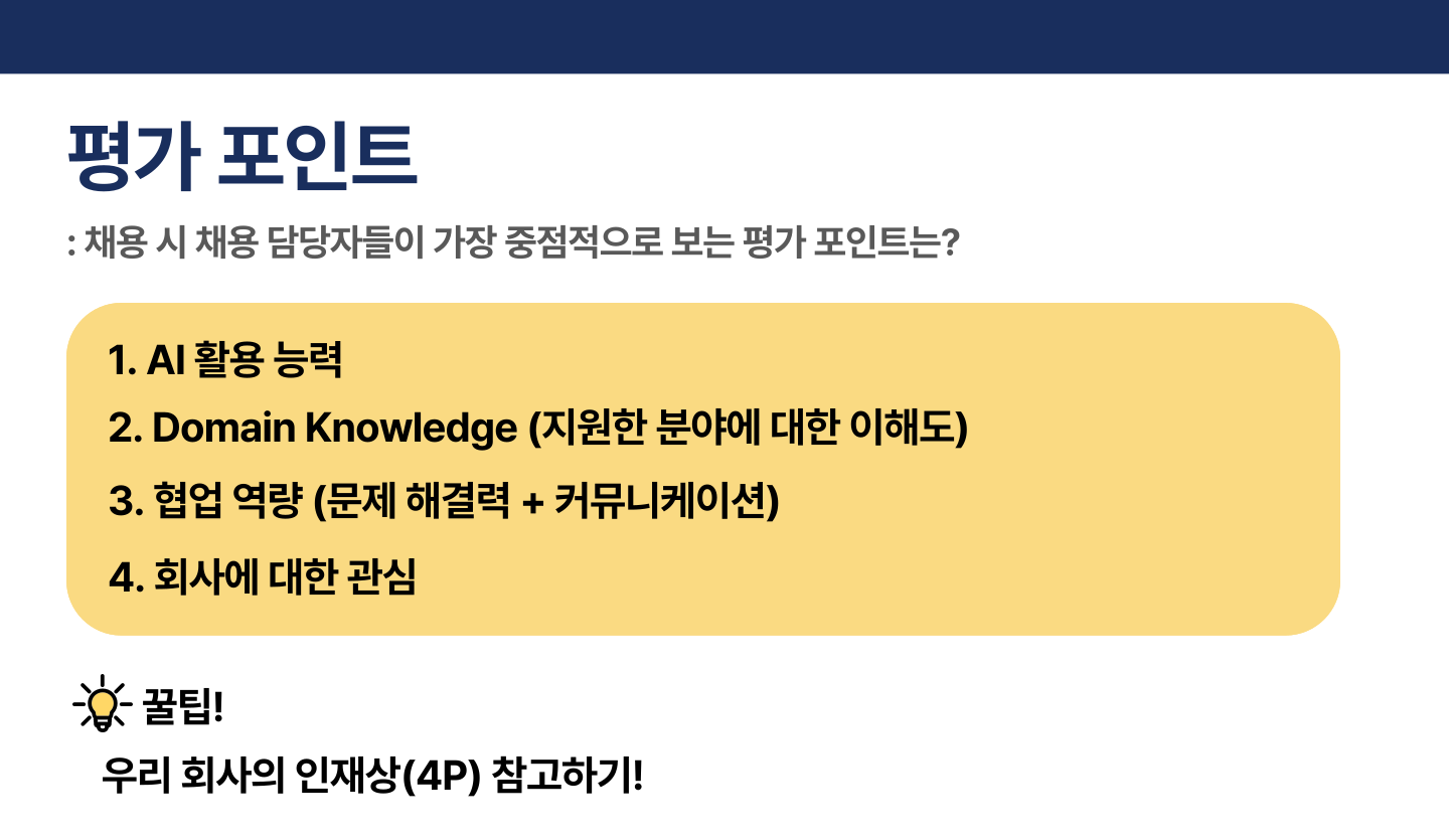 물론 AI 활용 역량을 갖추는 것도 빼놓을 수 없겠죠! 지난 5월 20일 올라온 SKCE – SK AX 신입 채용 전형 안내 영상을 보아도 알 수 있듯이 평가의 핵심 포인트 네 가지에도 AI 활용 능력이 1순위로 꼽힐 만큼 중요한 역량입니다. 그러나 그 외 세 가지 포인트는 ‘지원 분야에 대한 이해도’, ‘협업 역량(문제 해결 능력 + 커뮤니케이션 능력)’, 그리고 ‘회사에 대한 관심’이었는데요. AI가 업무 현장에서 절대 떨어질 수 없는 오늘날, AI를 얼마나 똑똑하게 활용할 수 있는지에 대한 방법을 공부하는 한편 그럼에도 불구하고 여전히 내가 회사에 필요한 이유는 ‘인간만이 할 수 있는 이해와 협업, 소통 능력’임을 잘 기억하시고 이를 어필하실 수 있도록 노력하시면 좋을 것 같습니다.