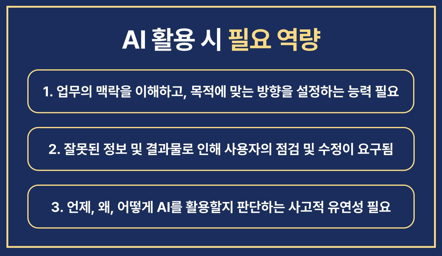 따라서 우리는 AI 활용 기술을 습득하는 것을 넘어 얼마나 더 창의적으로 그리고 새로운 방식으로 기술을 활용하고 전략을 세울 수 있을지에 대해 고민해 보아야 합니다.
